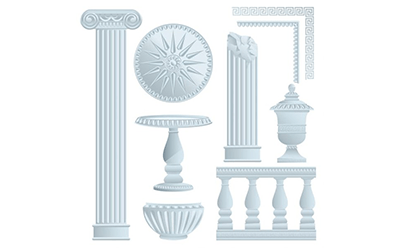 GRC構(gòu)件中羅馬的古典柱式包括希臘時(shí)期的3種,共有5種:多立克式、愛奧尼克式、科林斯式、羅馬式(塔司干式、復(fù)合式)。
